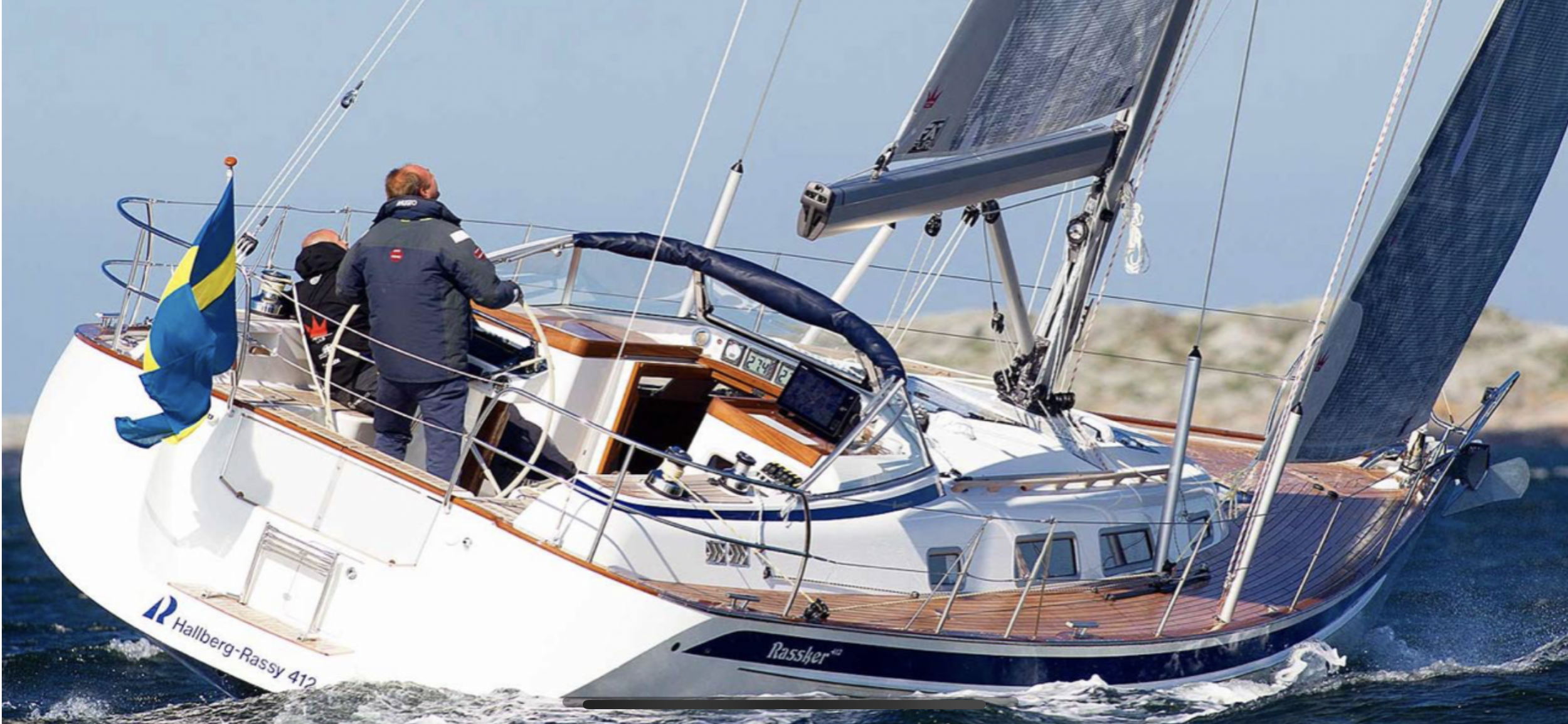 Background photo is Magnus Rassy, CEO of Hallberg Rassy taking the new 412 for a sail.