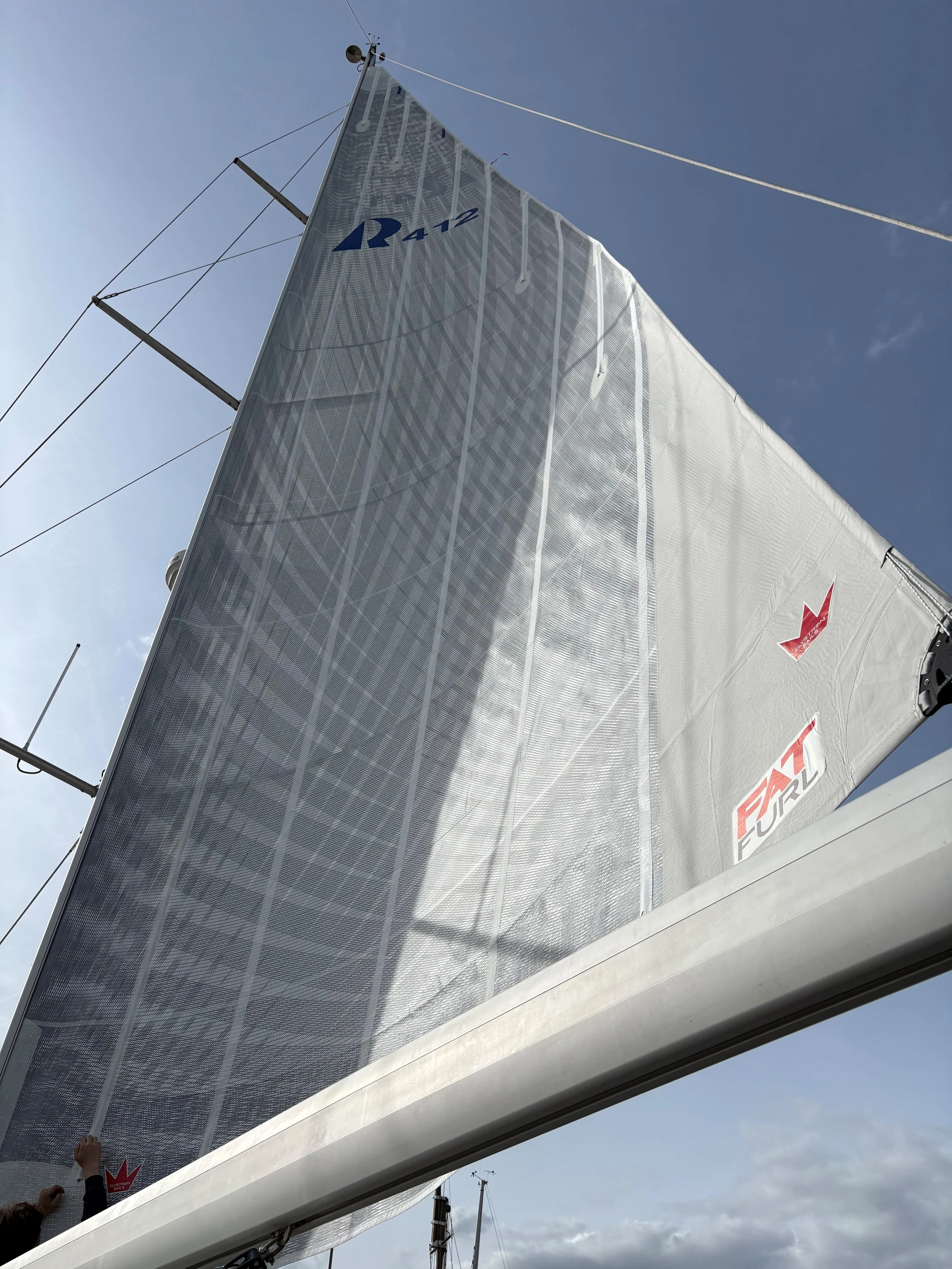 This morning the team from Elvstrom Sails UK (Tristan,Eddie and Ollie) arrived to fit the new replacement mainsail. (This is the sail that rolls away into the mast). On Luce Di Mare this is an innovative design by Elvstrom Sails in collaboration with Hallberg Rassy (my boat manufacturer) and Selden (the mast manufacturer). It enables a high performance, more powerful and better shaped sail to be created with a wide top board, which can be trimmed in a similar way to traditional mainsails that are common on most boats. They have called this a Fat Furl. As I understand it this the first time a wide top board sail has been developed that can roll away into a mast.