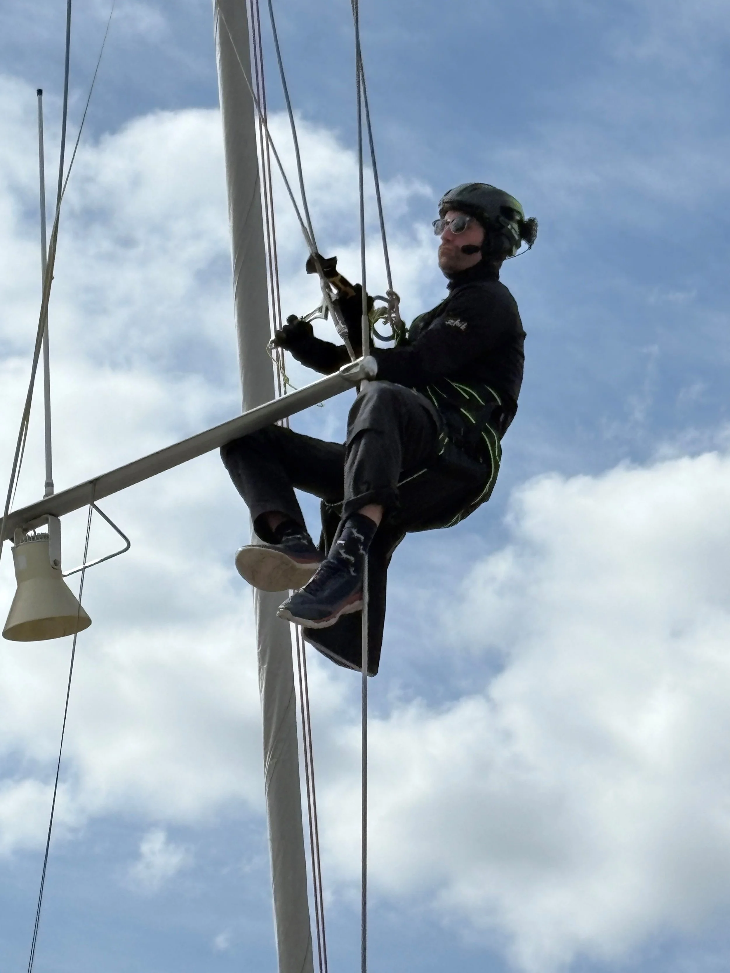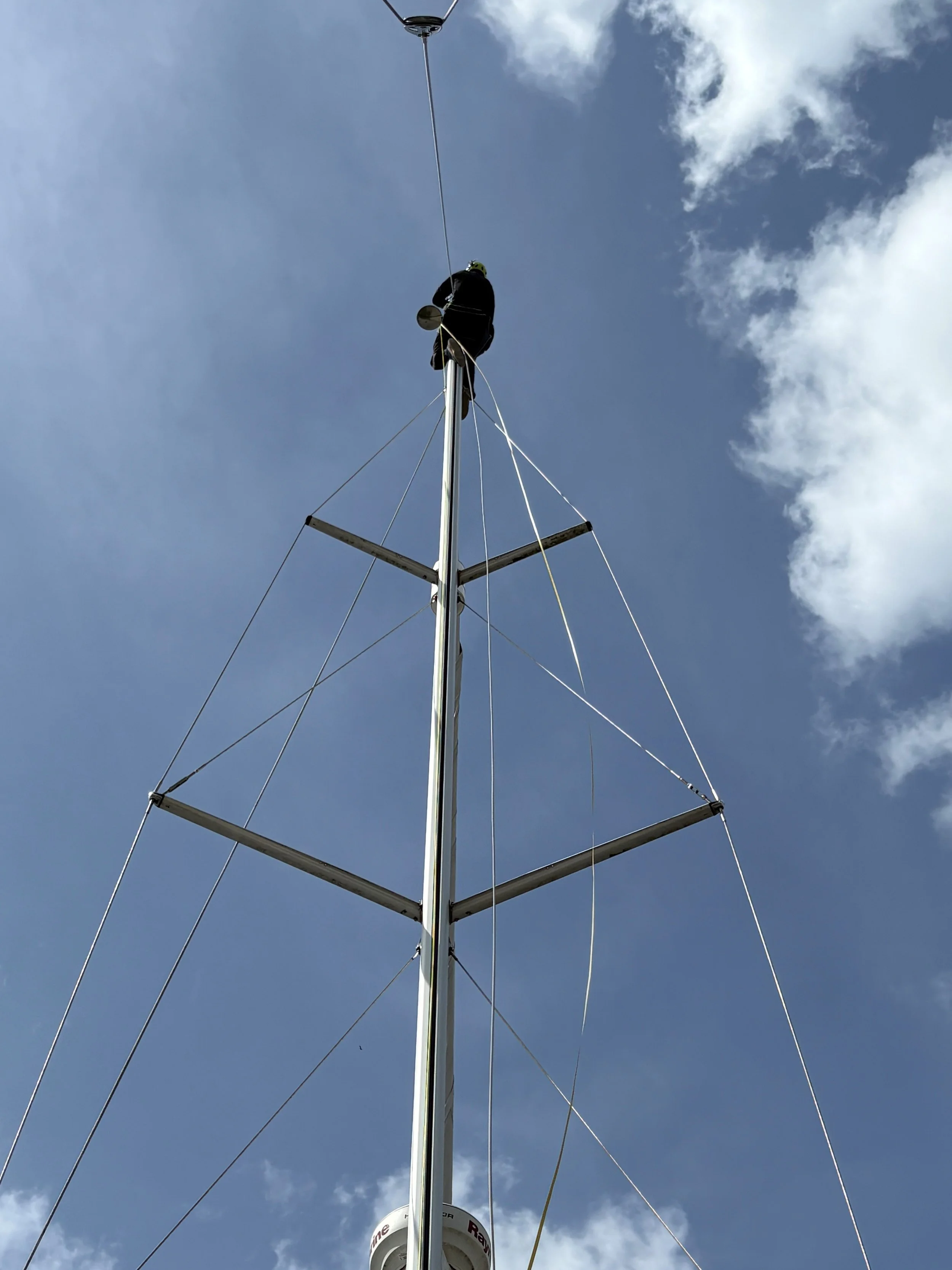 Last year my wind vain (This at the top of the mast and gives an accurate visual to the direction of the wind) I had replaced as it was damaged by roosting birds. However the contractor must have left it loose as it was not properly sited and served no use. I have been meaning to climb the mast to secure it. But as the Elvstrom UK guys were up the mast they kindly adjusted it and secured it for me. I was very grateful to them, as I wasn’t looking forward to a solo mast climb. Its hard work and more dangerous on your own.