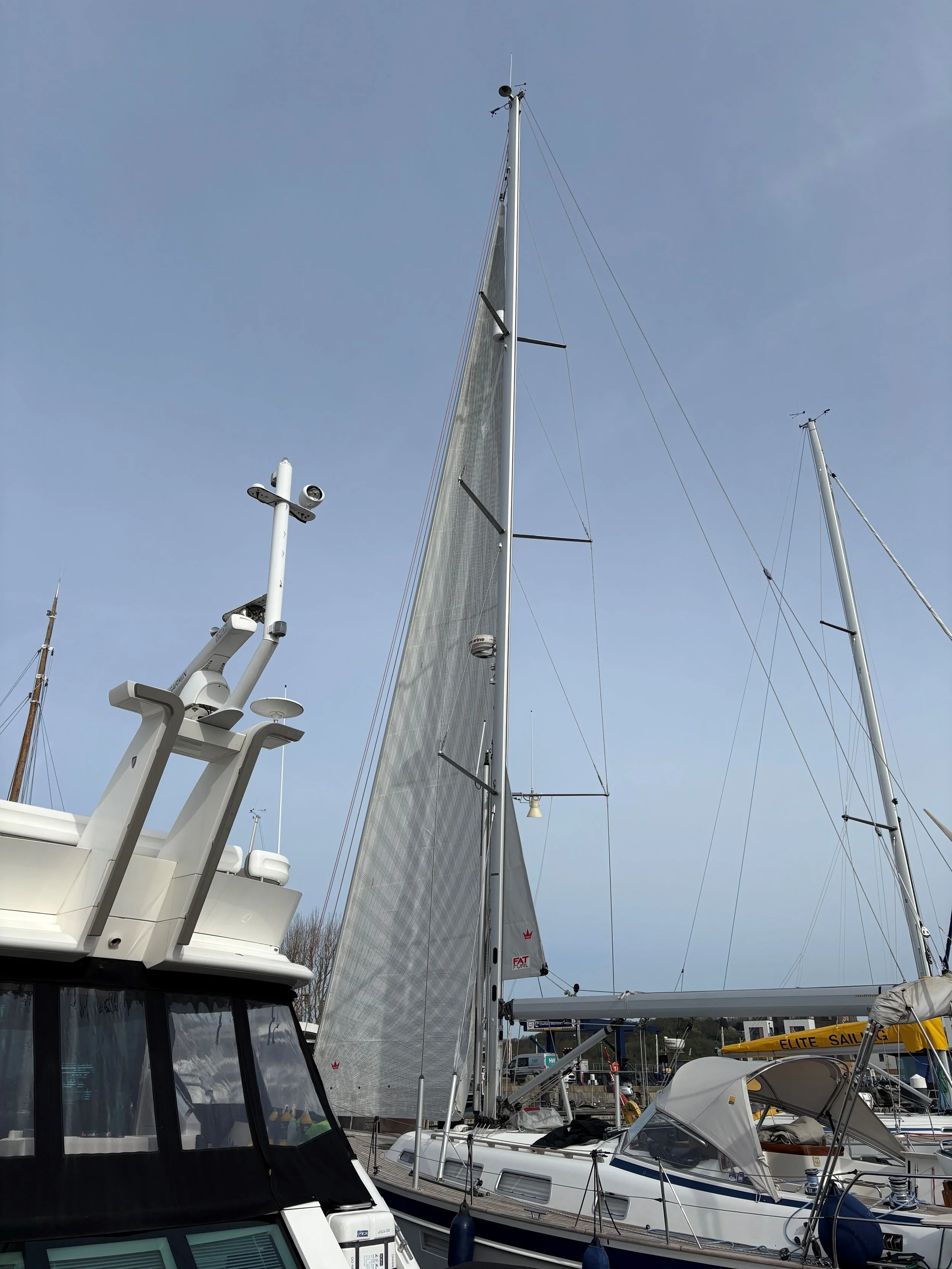 After our late lunch they set about checking their work. They adjusted the mandrel inside the mast (the bottom of the sail is secured to this) and then fitted the new Fat Furl mainsail. It took a little bit of experimenting the best way to furl the sail and they found the right settings for the sail to furl it into the mast without creasing. For my own use, I noted they took the tension off the back stay which I always do, but instead of leaving the outhaul (this is a rope attached to the clew (rear) of the sail allowing it to be pulled out of the mast) under tension as I usually do whilst the sail is being furled, they left it controlled but loose and the sail furled away beautifully.