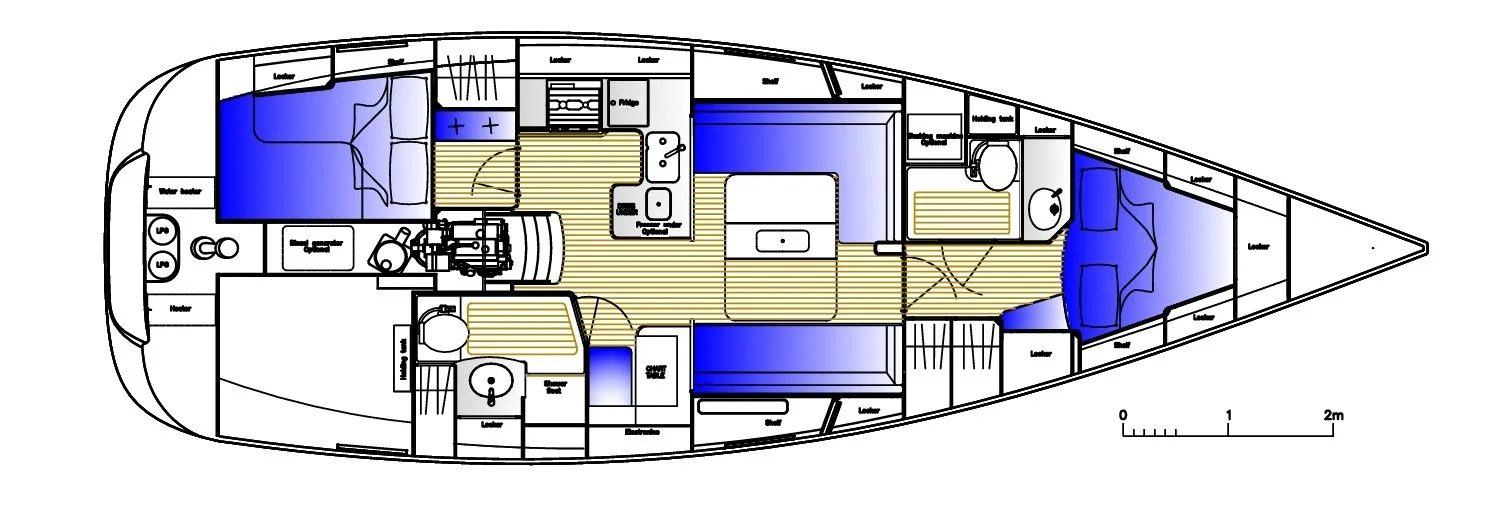 Luce Di Mare is a Hallberg Rassy 412 (12.6 mtrs) and is laid out as shown in the diagrams and photos below